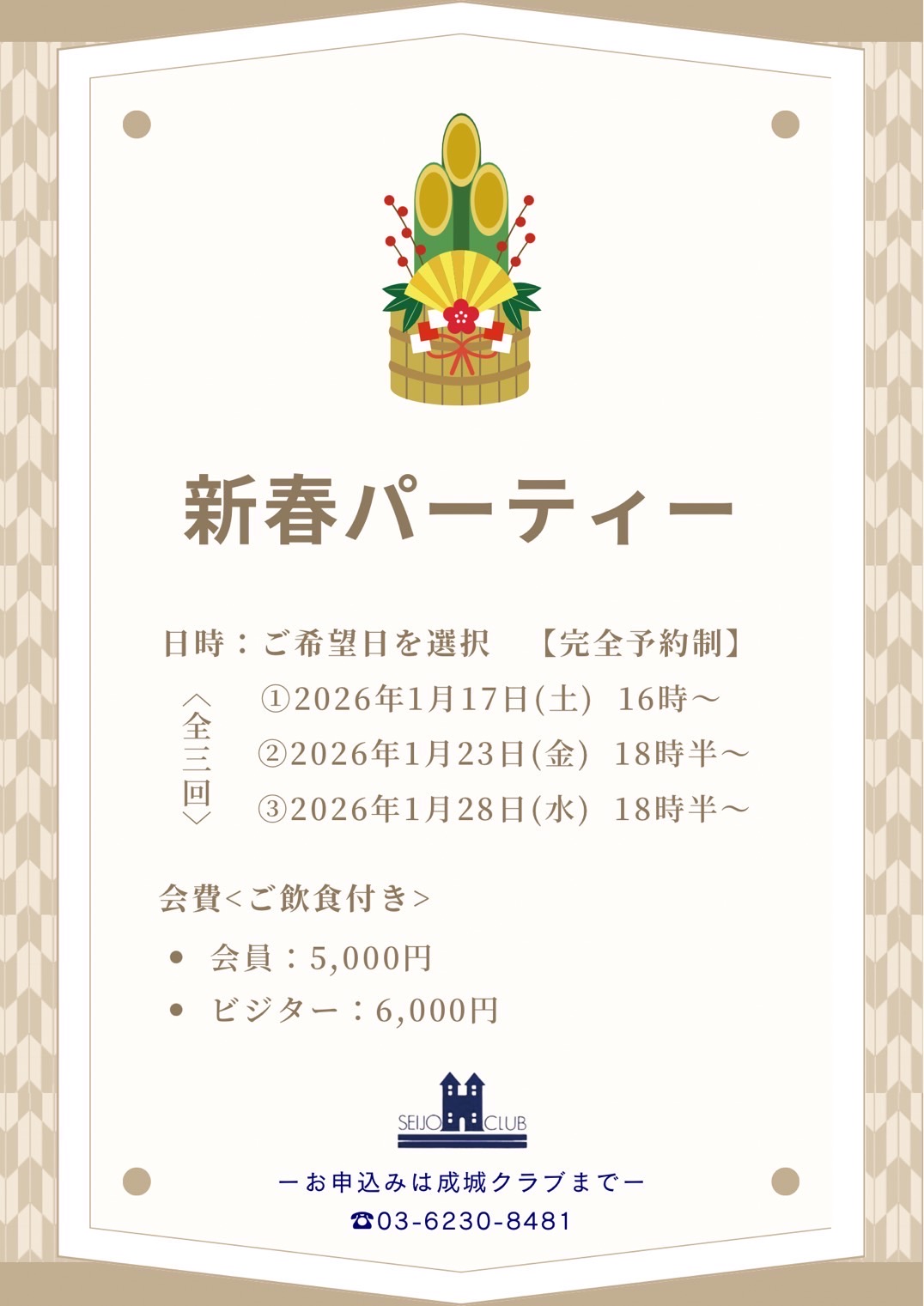 新春パーティー1月17日(土)16時、1月23日(金)18:30, 1月28日(水)18:30からです是非ご参加ください 詳細はここをクリック