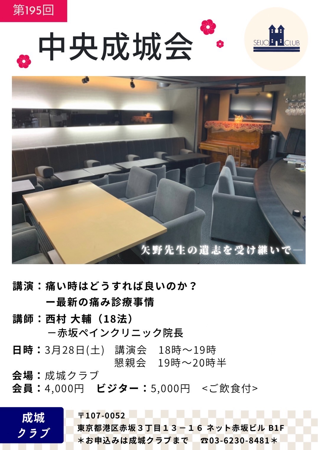 中央成城会 3月28日(土)18時から「最新の痛み診療事情」西村大輔先生 詳細はここをクリック